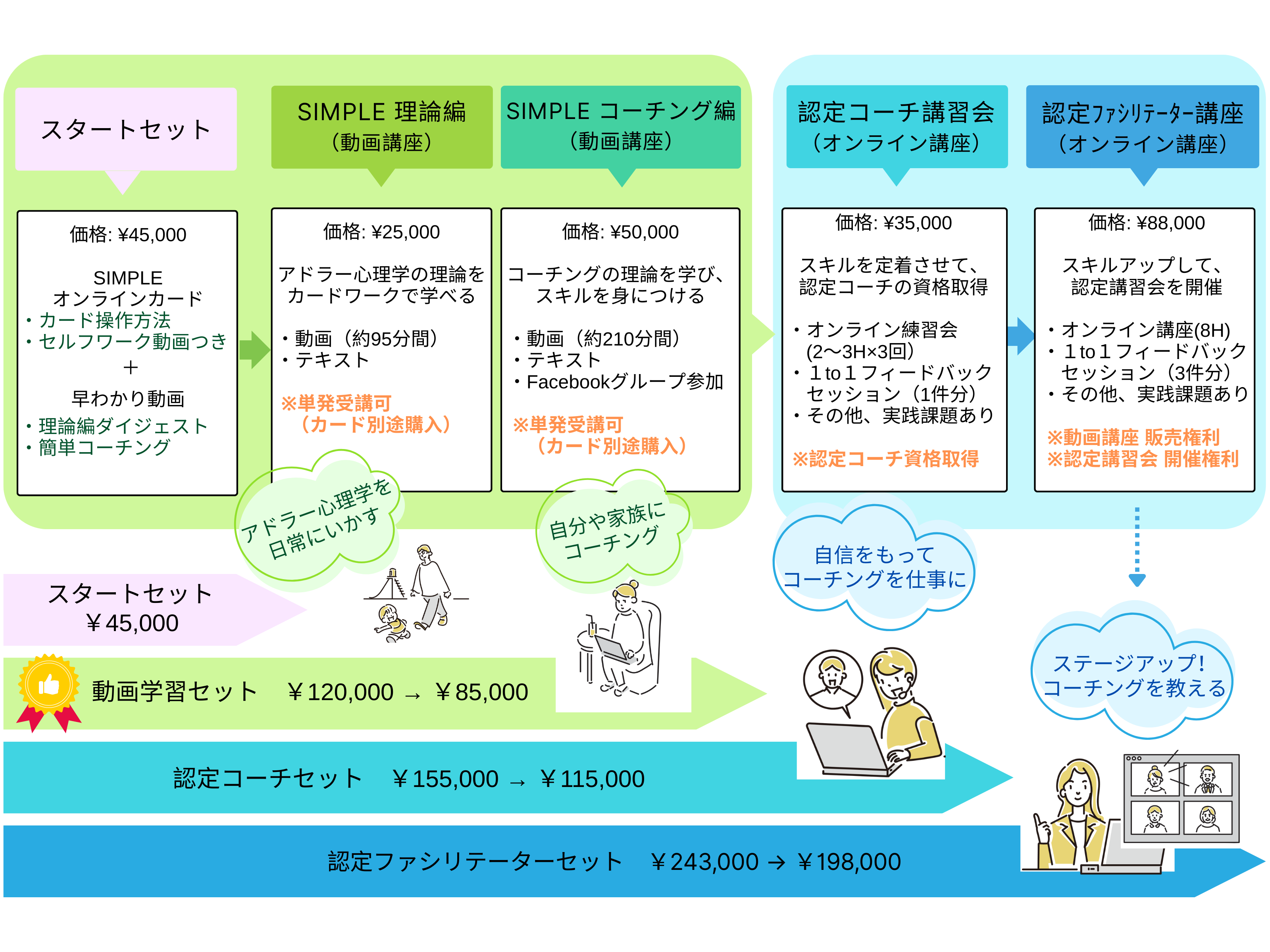 「認定コーチまで進みたい」など、目指す資格が決まっている方には、セット受講がお得です。各講座の受講料については、講座の詳細をご覧ください。 -